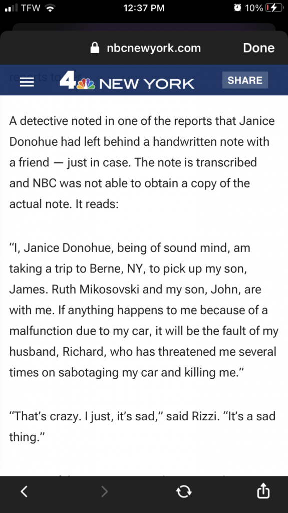 Her husband Richard Donohue was POI and did not report her missing until 3 weeks after she went missing. That would be if her husband was truthful with that date. Janice’s son Chad believes his Uncle Edward may have been an accomplice and hung himself on the property/family home in Brentwood in 1998. He was said to be scared of his brother Richard Donohue. If nothing else, it’s suspected he might have helped give Richard the needed alibi to keep his nose clean.