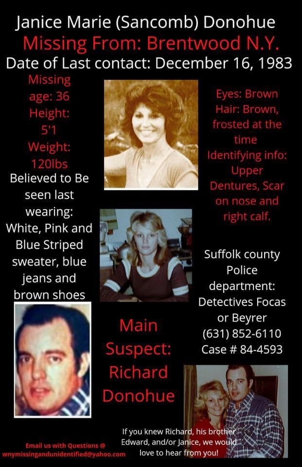 Janice was last seen at her home on Wicks Road in Brentwood, New York at 9:00 p.m. on December 16, 1983. She has never been heard from again. Her husband, Richard Donohue, reported her on January 5, three weeks later. He said he'd worked late, come home and gone to bed, and when he woke up, Janice was gone and their four-year-old son, Chad, was in his crib crying. He stated they were having marital problems and he thought she simply left.