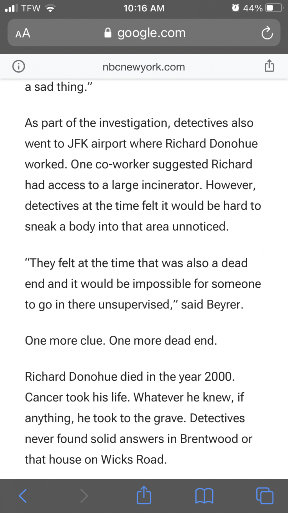 Richard Donohue also worked at JFK Airport (The best educated guess of detectives that have attempted to decode the note foundin CCJD’s pocket from Blue Boy Motel) was that the numbers were direct lines within JFK Airport)with access to an incinerator, although unlikely, as it’s Avery public place. It’s said Richard may have had cartel/mafia ties as well as he was definitely in the drug trade. His home and the trunk of her inherited Cadillac were cleaned between these times. Her Cadillac was located at the family home as far as we can tell. Detectives say water was running much more than usual during this time as well.