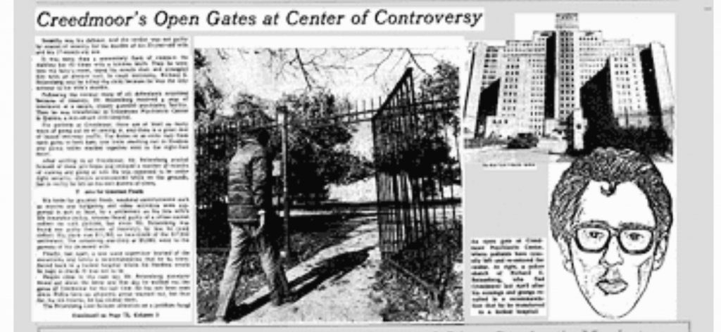 On April 6, 1977, Richard Riesenburg walks out of Creedmore, taking with him 19 year old Judith Anne Brown, who was receiving outpatient treatment at nearby Hillside Medical Center.