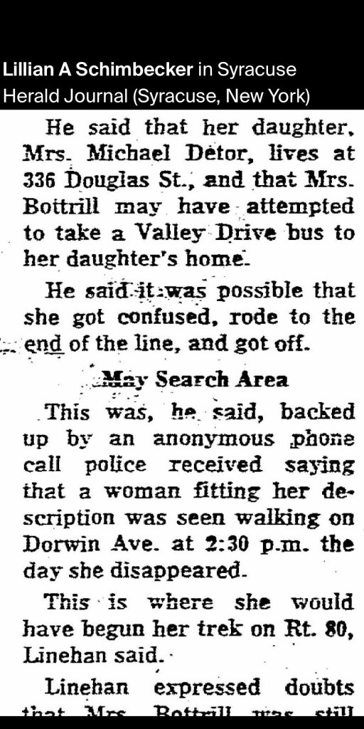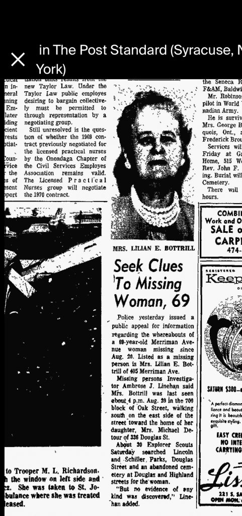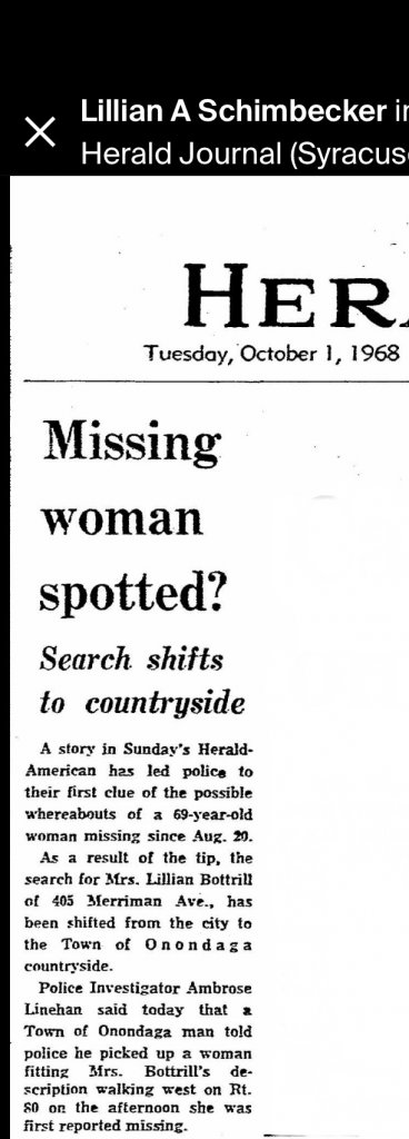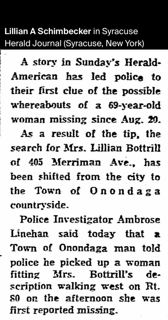 There is a “Lillian” listed on the gravestone of William Bottrill. Birth year for Lillian is 1900, Death year is blank. This is likely the gravestone of the missing Lillian Bottrill. Cemetery is: Assumption Cemetery and Mausoleum. Onandaga County, Syracuse NY.