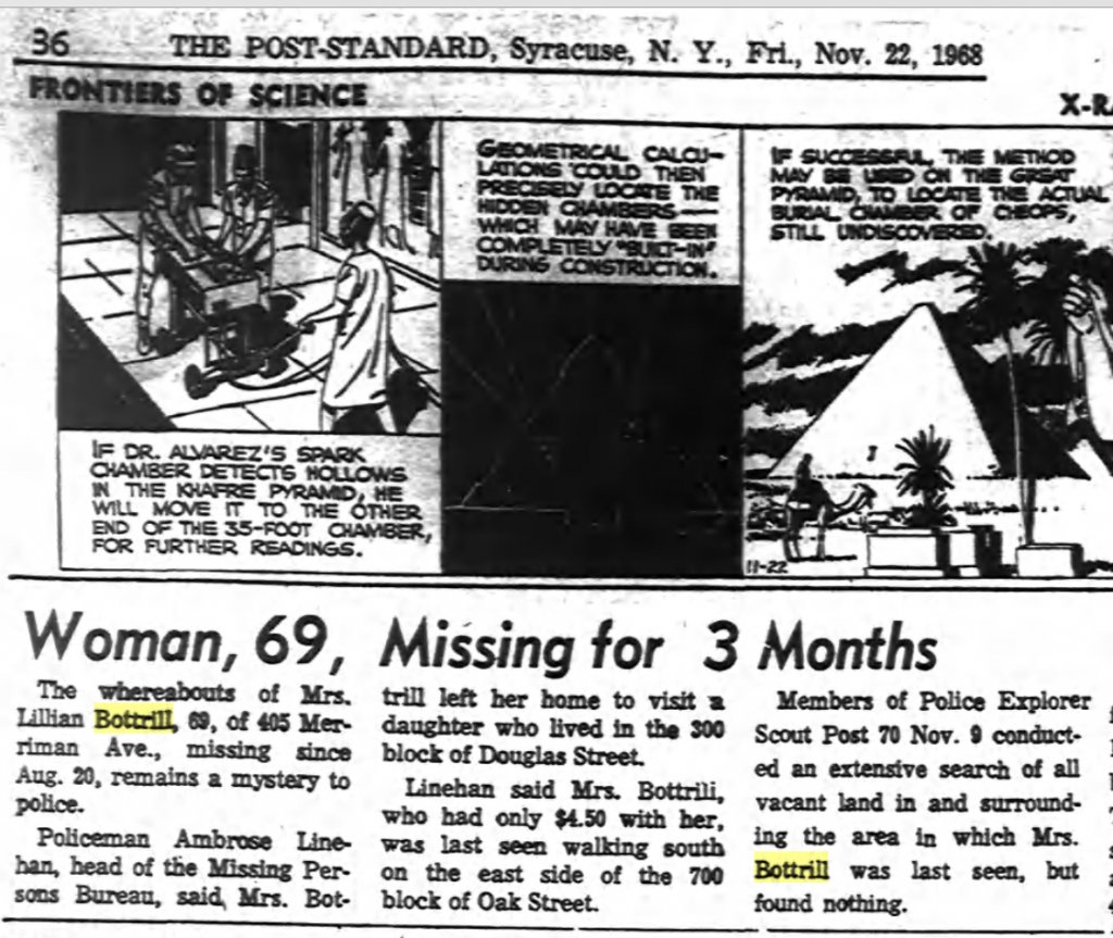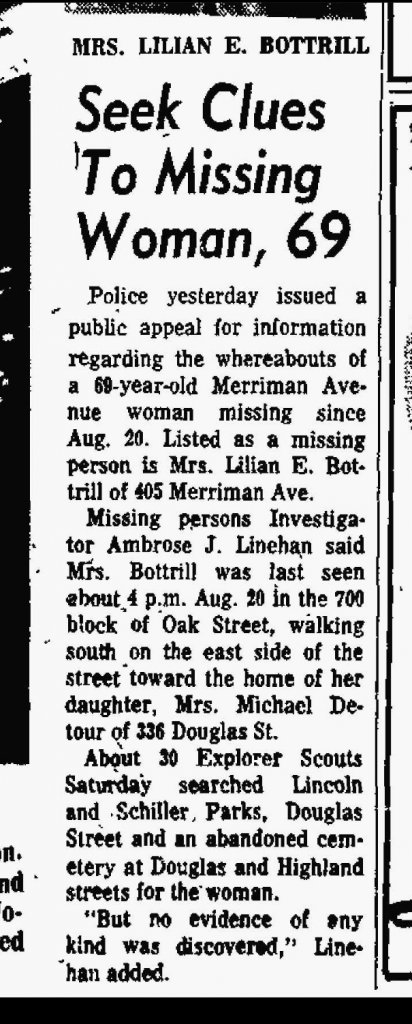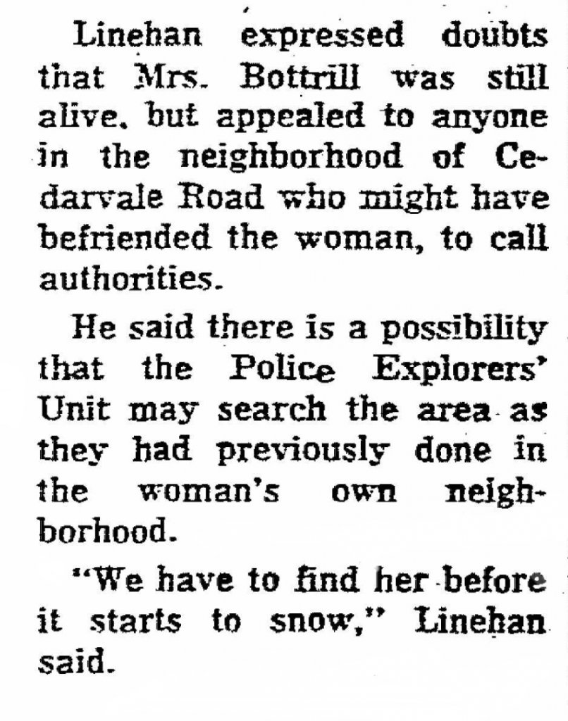 Hi, I was contacted by a relative and asked to comment here since I happen to know something about the case. It was a very long time ago, but, briefly, this is what I remember. The investigating officer was Det. Ambrose Linehan (sp?) who handled missing persons cases at that time. IIRC Mrs. Bottrill lived alone in an apartment, not far from her adult daughter's residence. I do not recall if she was receiving any form of public assistance other than Social Security. On the day in question Mrs. Botrtrill left her apartment to visit her daughter. She had with her a purse, probably with a few dollars. It was very hot and she stopped at a nearby delicatessen and ordered a glass of cold buttermilk. It was apparently there that she mentioned she was going to see her daughter. She finished the buttermilk, left the store and that was the last confirmed sighting of her. This was quite unusual because rarely do persons simply vanish from a city street. Mrs. Bottrill was know to be overweight and may have had early dementia or Alzheimers, in any even diminished mental capacity but was capable of conducting activities of daily living and, as noted, lived alone. It was initially assumed that she had simply became disoriented and wandered, Mrs. Bottrill, however, was not known to wander. It could not be established if she had a possible alternate destination. A search of the area was conducted, neighbors and local businesses, hospitals, etc. contacted. Bus and taxi drivers were questioned on the theory that she might have gotten on a bus or cab and left the immediate vicinity but that did not appear to be true. There was high confidence at first because there was no reason to believe that an overweight, 69 year old woman could simply vanish. Then it was theorized that if she had somehow wandered away and died in some obscure location, perhaps from a heat stroke, the body would eventually be located by the smell. This did not happen.