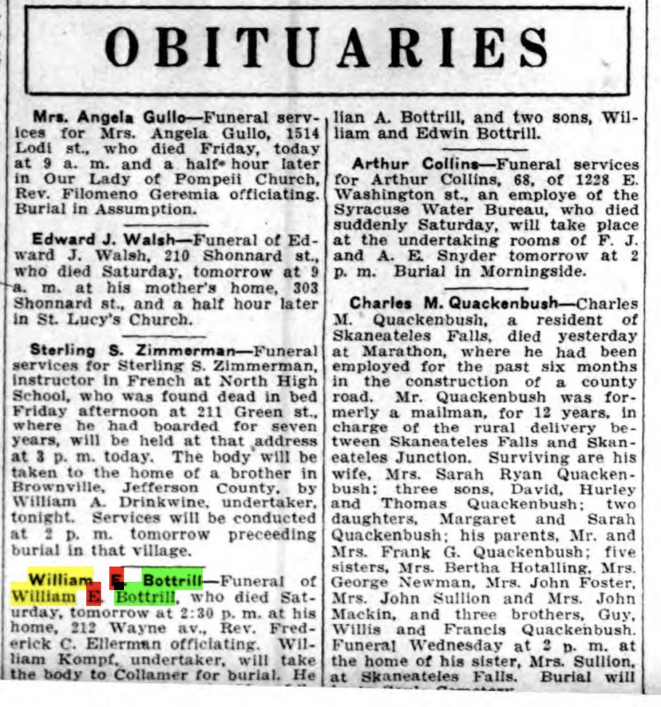 I can find no genealogical proof for a Lillian E. Bottrill. There are only 2 graves listed on Find-a grave For a Lillian Bottrill. One is Lillian Anna Schimbecker Bottrill 1887-1965 in Woodlawn Cemetery in Syracuse NY and Lillian Alice Bottrill 1924-1981 in Australia. This doesn’t mean that a Lillian E does not exist or have a grave. It only means that IF one exists, it is not listed.