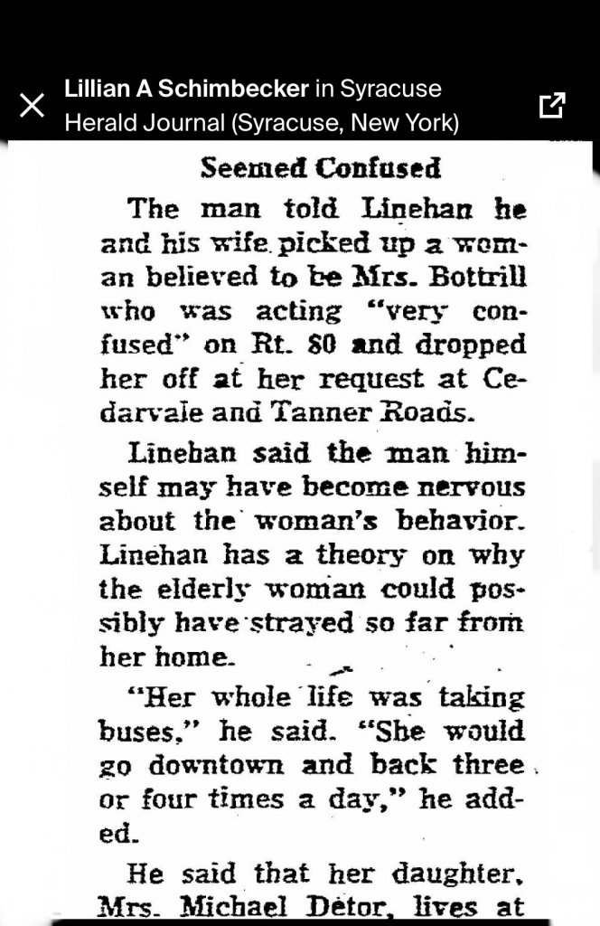 From newspapers.com Syracuse Herald Journal, 16 Oct 65, pg 22. I believe this is the lady referenced in your post: