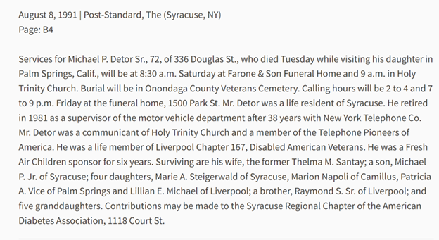 1. A news article shared earlier in the thread by HeatherA revealed that Lillian may have been headed to 336 Douglas St. to see her daughter, “Mrs. Michael P. Detor”. A search of the Onondaga County real estate database shows Michael P. Detor in fact owned the house until 1994. (See: Picture 1)