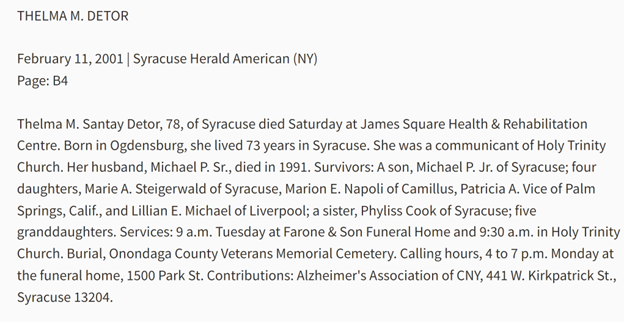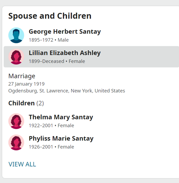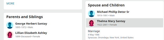 3. Michael P. Detor’s wife’s name appears to be Thelma Santay, per the above obituary. An ancestor search (See: Picture 3) reveals Thelma Santay’s mother was Lillian Elizabeth Ashley. There’s a good chance Lillian Elizabeth Ashley is Lillian Bottrill considering both would have been 68 in 1968, although I’m not understanding how she got the name Bottrill. Ideas?