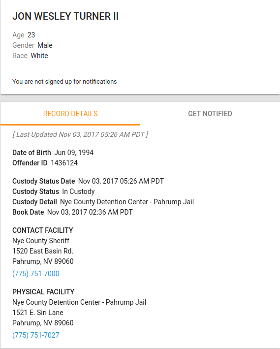 I haven't found a media report or a mention of the Sheriff's Office FB page yet. However, Jon Turner is in VINE Link for Nevada.