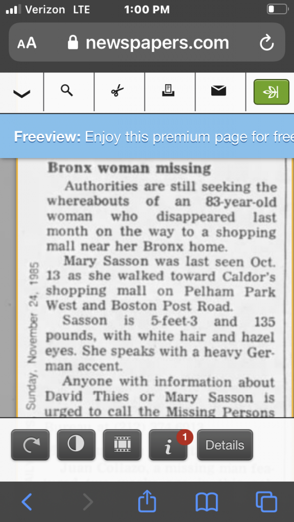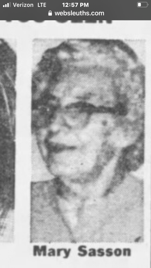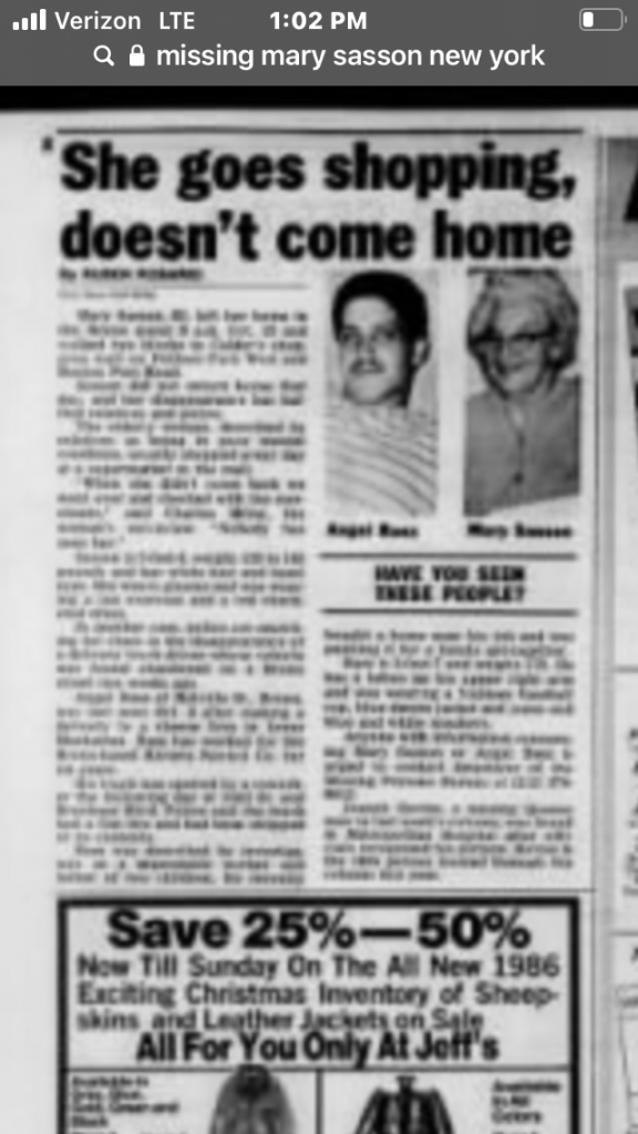 Details: Eighty-three-year-old Mary Sasson vanished while on her way to the supermarket in the Bronx at around 8AM on October 13, 1985. She has not been seen since. According to her family, she is of poor mental condition.