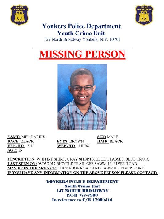 Mel Harris was last seen on the bike trail off of Saw Mill River Road around 1 p.m., according to the Yonkers Police Department. He was reported missing around 3:30 p.m. on Saturday.
