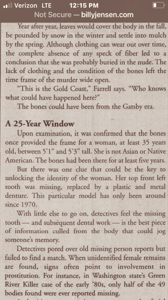 Skeletal remains found on 11/10/2001 by a Boy Scout Troop hiking in the Muttontown Preserve, approx 300 feet from the nature trail entrance on Muttontown Rd and approx 75 feet off the trail.