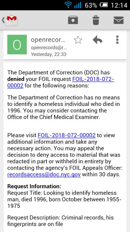Request denied. They say contact the ME. Will the ME have his prints? If we could attach his prints to the foil request perhaps it would narrow things down for them. In any case, I don't know what to do next and I only have 30 days to appeal to them. Any ideas?