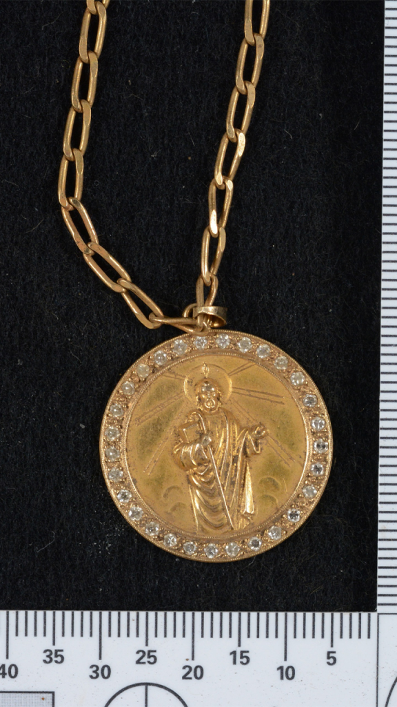 This medallion was found on the body that was found rolled up in a carpet by the old Flushing airport. It's believed the individual died between 1990 and 1999.