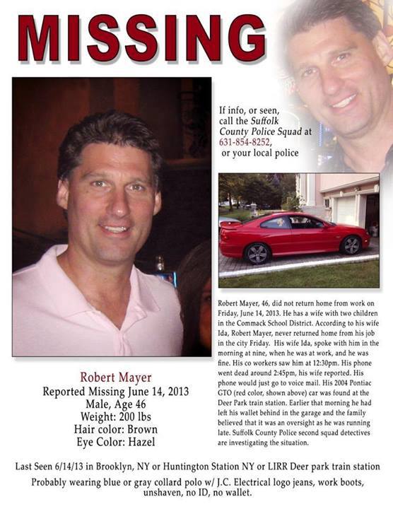 "Friday, 6/28/13 There will be a search party held at the Deer Park Train Station starting at 9:00am. Please park your car NEAR the Deer Park Train Station as it probably will be hectic with morning commuters. We will be meeting at the main ticket booth (which looks like a little house) Permission has been granted from the Suffolk County Police Dept. as well as anyone else that needed. If you can join the search efforts please contact, Kim Bonomo she will be leading the search efforts. The search will start at 9:00am and will be done in shifts. Please contact her for additional information. News 12 has been contacted as well. Prayers for the Mayer family."