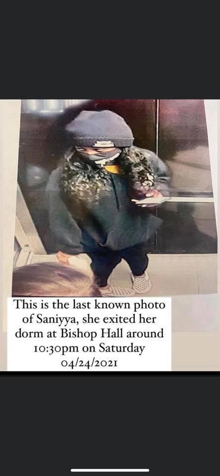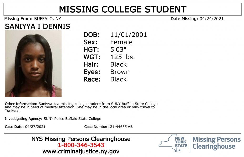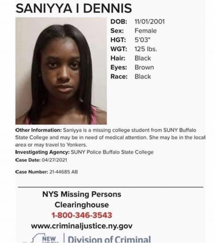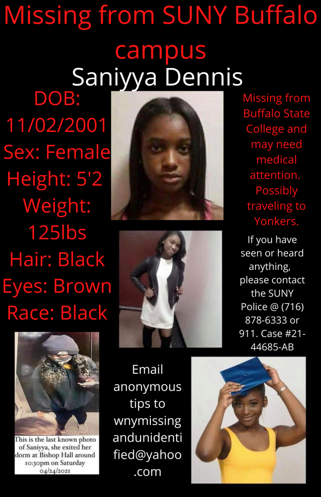Saniyya Dennis was last seen on camera exiting her dorm at Bishop Hall at 10:30 pm 4/24/2021. Saniyya is a SUNY Buffalo College Student.