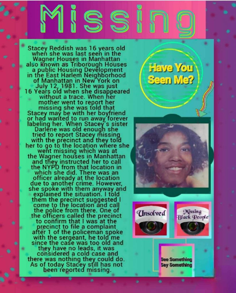 Stacey Reddish was 16 years old when she was last seen in the Wagner Houses in Manhattan also known as Triborough Houses a public Housing Development in East Harlem Neighborhood of Manhattan in New York on July 12, 1981. She was just 16 Years old when she disappeared without a trace. When her mother went to report her missing she was told that Stacey may be with her boyfriend or had wanted to run away forever labeling her. When Stacey’s sister Darlene was old enough she tried to report Stacey missing with the precinct and they told her to go to the location where she went missing which was at the Wagner houses in Manhattan and they instructed her to call the NYPD from that location in which she did. There was an officer already at the location due to another crime. However, she spoke with them anyway and explained the situation. I told them the precinct suggested I come to the location and call the police from there. One of the officers called the precinct to confirm that I was at the precinct to file a complaint after 1 of the policeman spoke with the sargeant, he told me since the case was too old and they have no leads, it was considered a cold case and there was nothing they could do. As of today Stacey still has not been reported missing.