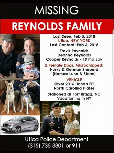 It's Travis & Deanna Reynolds, the baby's name is Copper. He is in the military at Fort Bragg, NC. They were visiting family in Utica. Left and went to get a bite to eat and never returned.