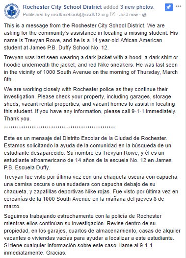 Interesting that rather than school #12 or the Rochester School District heading up the community search efforts, it's my own son's school (Mary Cariola) and Autism Up that are taking the lead here.
