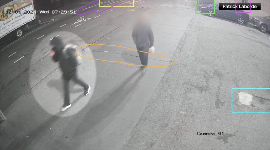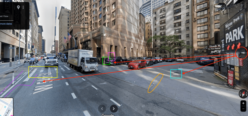 Note: I geolocated the footage of the suspect on the phone which was obtained by CNN and found it was filmed from a west-facing security camera at a parking lot on W 54th Street. Suspect was walking eastbound on the north side of the street towards 6th Avenue.