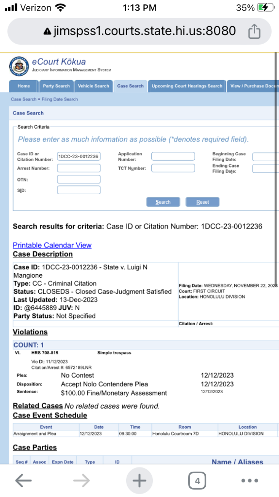 Hawaii court records are publicly searchable online. A quick search shows a criminal case for LM last December, plead no contest resulting in $100 fine.