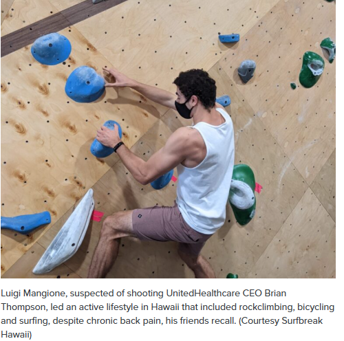 I lived in Hawaii from Jan 21 to July 23 and masks were REQIRED still until like fall of 2022 I think it was, maybe even longer. They had a mask mandate for longer than any other state so if he was living there in 22-23, then it's possible that it was required for him to wear the mask while indoors at this rock climbing gym.Pic from the article you posted. Looks like I might have been on to something with the reason Luigi wore masks. If he's wearing one all alone on a rockclimbing wall... he's doing it because of Covid. JMO So, it might have been more than trying to hide his face. It would also be why he had a box of masks in his backpack (someone posted that info and source above)