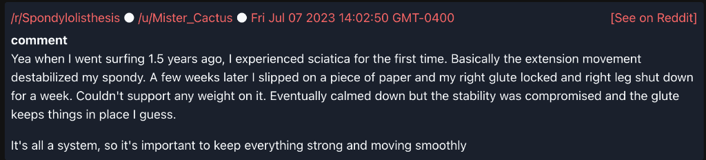 "Spondy" may indicate a pre-existing condition. Quote from ClevelandClinic.com: Spondylolisthesis ehappens when your vertebrae are cracked or weakened enough ... to slip out of place. If a slipped vertebra presses on a nerve, you may develop shooting pain in your legs (sciatica). Some people need surgery to relieve spondylolisthesis symptoms ...With the newest admin ruling, here's an archived post from LM's reddit account: