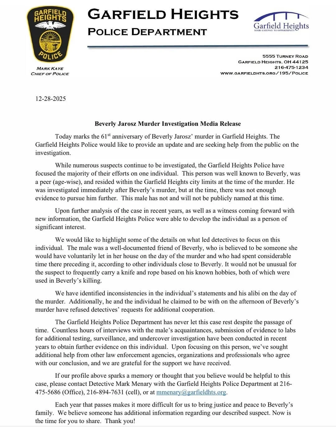 Garfield Heights police on Sunday provided an update on the investigation into the murder of Beverly Jarosz, which has gone unsolved for 61 years.