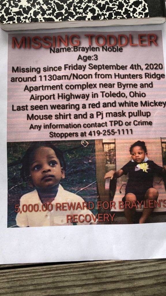 Braylen Noble was reported missing on Friday, September 4, 2020, at approximately noon from the area of Gibraltar Heights Drive, Toledo, Ohio. Braylen is a 3-year-old nonverbal black male.