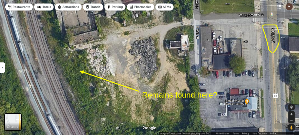 In article is a pic of cops, pile of rubble nearby, and then woods and train cars further back. 1800 block of S. High. Based on that, here is satellite image of what I believe is the approximate area where remains were found. Looks like a convenient dump site....