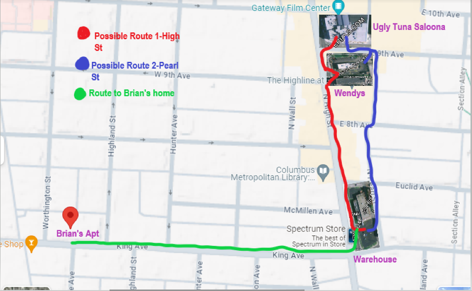 There are 2 potential routes Brian could havr taken; Red shows the route down High Street and Blue the route down Pearl Street. Green indicates the further route to Brian's apartment (the sniffer dogs didn't trace him this far though). As can be seen, both the Wendy's and the warehouse would be on Brian's route home so in this sense it makes total sense that he indeed left the complex (by whatever exit) and made his way towards home.