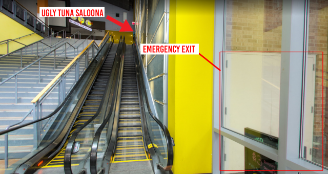 More, so I am assuming here that the exit door at the top of the escalator leads to the emergency exit door to the outside right of the entrance doors. When I was there I do remember an alarm warning on the exit door. If not I would have gone it lol