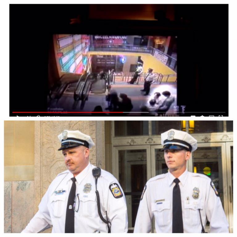 As I tried to explain in previous posts, the bar is to the right of that landing at the top of the escalators. The cops are standing on the left, the bar entrance with bouncers is on the right. So you have a lot of supervision at the exact area where I've seen the old construction doors were. I think it's impossible that the police would have not seen someone trying to go through those doors, or if they did, to just a random drunk guy wander into a construction zone.