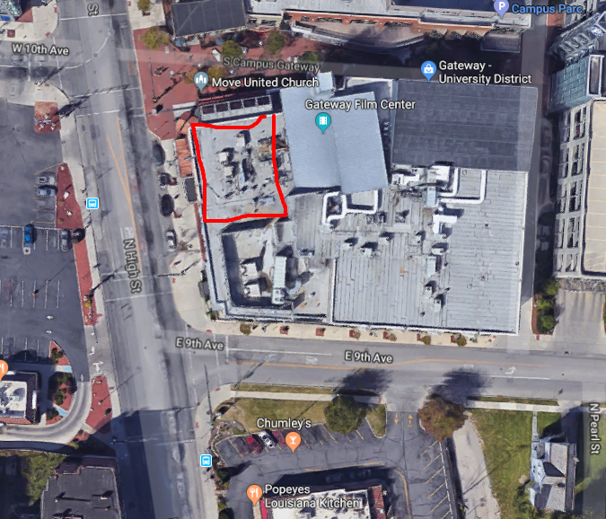 2) per attached aerial image (former UTS space in red, Sunflower Market due south and east), East 9th Ave and N. High St. are not quite perpendicular, and the building in which Brian was last seen is thus not quite square. Thus opening some chance for an angled crevice. I had a look in and around the building last year to the extent I could w/o getting hassled, and concluded that it appeared to have been built all at once rather than in sections over years. Thus, chance for some odd crevice didn't seem high to me, nor the between-walls scenario. The roof, as you can see, has a lot going on, lots of HVAC etc. Gateway Theatre roof in particular is unusual, arched as it is and distinct from rest of roof.....FWIW...