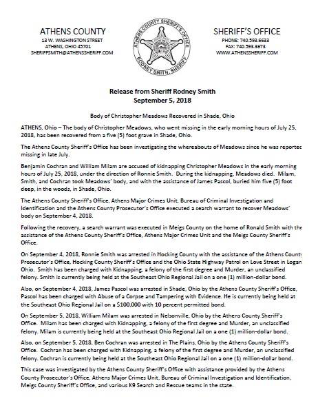Release from Sheriff Rodney Smith: Body of Christopher Meadows Recovered in Shade, Ohio