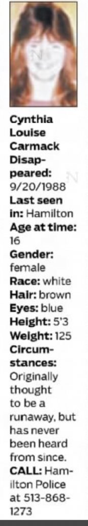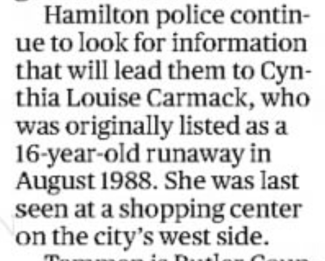 Carmack was last seen on September 20, 1988 in Hamilton, Ohio.