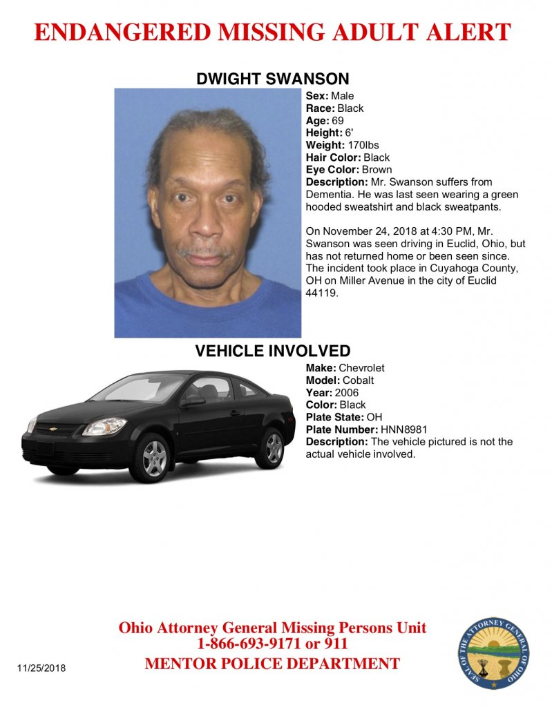 SILVER ALERT: Mentor Police seeks the public’s assistance in locating Dwight Swanson, a 69 year old male with signs of dementia. He has been missing since 4:30 PM yesterday after dropping off a friend in Euclid. Mr. Swanson was wearing a green sweatshirt and black sweatpants, and driving a black 2006 Chevy Cobalt with plate number HNN 8981. Please contact Mentor Police at 440-255-1234 with information.