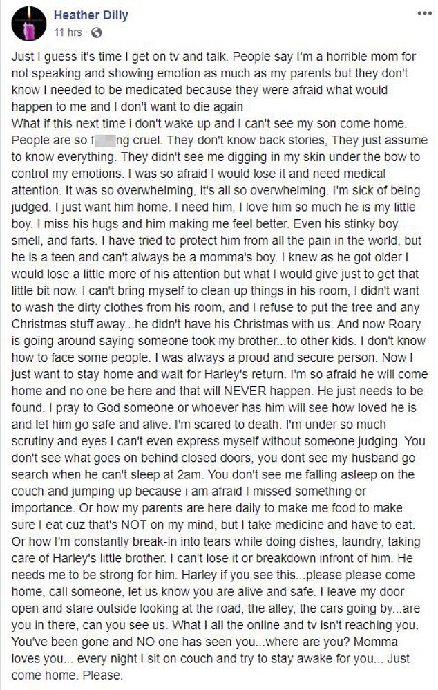 Agree with you on all of this.BBM ~ yep! And if you follow the MSM link in your post and read her FB post from last night, she starts it out with "Just I guess it's time I get on tv and talk..." because going on tv to try to find your missing 14-year-old son is such an annoying inconvenience I guess.And you can read the rest of her bizarre post. She has made it about herself from the very beginning, she is extremely manipulative and it appears to me that she manipulates and gaslights Harley into some of his "bad behavior". Sadly I have known mothers like this, that's why it's so glaringly obvious to me. Notice all of her pleas for him to come home center on HIM coming home to make HER feel better. Including coming home to lay on top of her until she feels better (the Grandfather actually said this). WTH??
