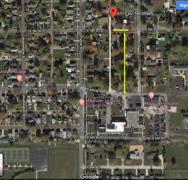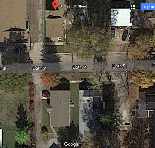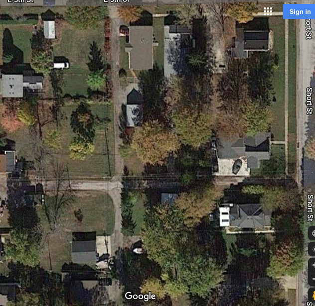 The alley Harley used is near direct south in front of Harley's home. These four images show the path. If you look at the last image marked by me - he likely took the white route by the white house and not the yellow route by the yellow house.