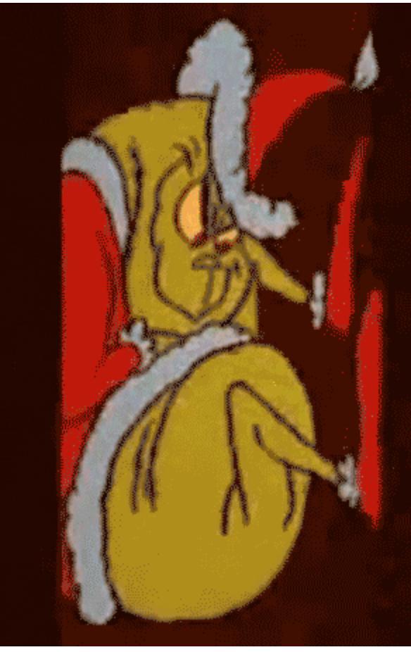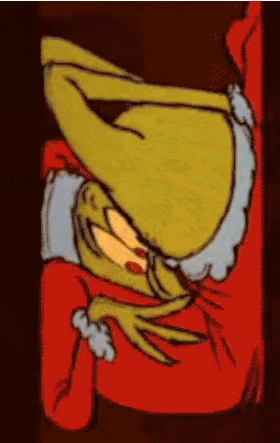 I am definitely at a loss here, because while I do understand how the Grinch got bunched up, I do not know what size chimney Grinch was travelling through. I know gravity/speed can cause odd things to happen but unless you're a stick figure, how the heck would you get bunched up in 9X13 space...that's the size of a pyrex dish. Yikes poor kiddo