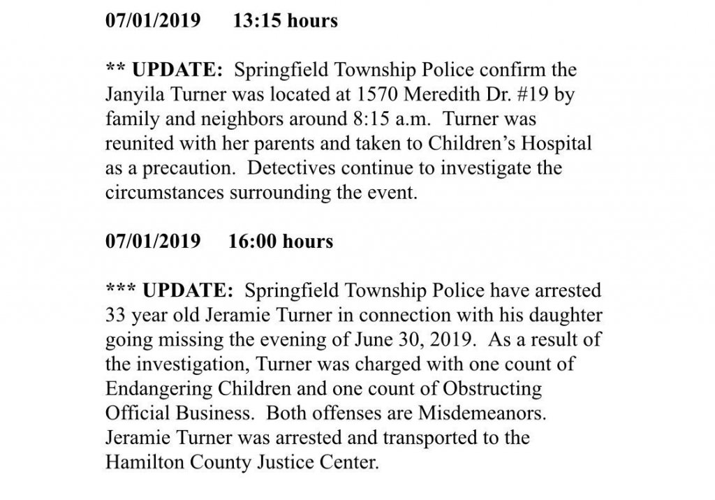 DEVELOPING: 3 y/o Janyila Turner is safe and according to her mother, is doing well after being reported missing last night. Police say her father Jeramie Turner, has been arrested & charged with 1 count of endangering children & 1 count of obstructing official business. @FOX19