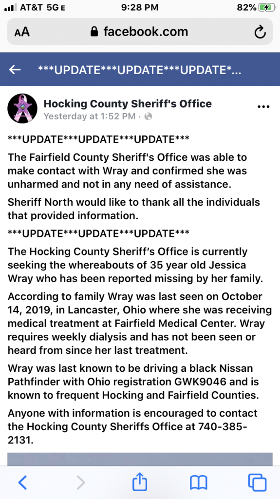 Wray was last known to be driving a black Nissan Pathfinder with an Ohio license plate of GWK9046.