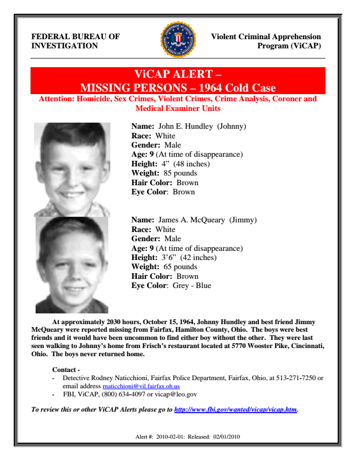 At approximately 2030 hours, October 15, 1964, Johnny Hundley and best friend Jimmy McQueary were reported missing from Fairfax, Hamilton County, Ohio. The boys were best friends and it would have been uncommon to find either boy without the other. They were last seen walking to Johnny’s home from Frisch’s restaurant located at 5770 Wooster Pike, Cincinnati, Ohio. The boys never returned home.