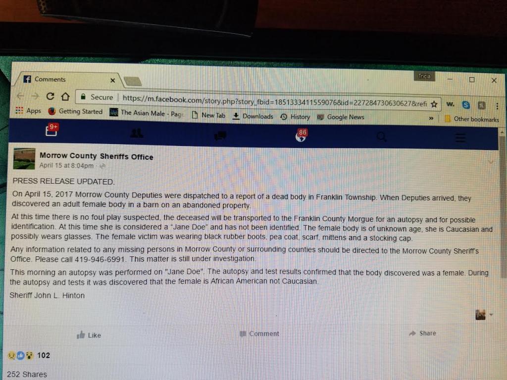 "When they arrived, they discovered an adult female body in a barn on an abandoned property."