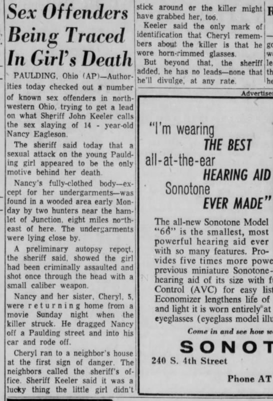 Also attached is an article from the Sandusky Register that mentions a theory that Nancy's murder could be related to the murder of a 9 yo Chicago girl, Gloria Kowalewicz. The problem with that theory, AFAIK, is that Gloria's killer was identified.