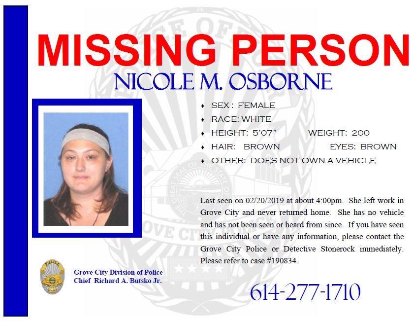 The Grove City Division of Police say they are searching for a missing woman. Police say Nicole M. Osborne was last seen on February 20, 2019 at 4:00 pm when she left work in Grove City and never returned home.