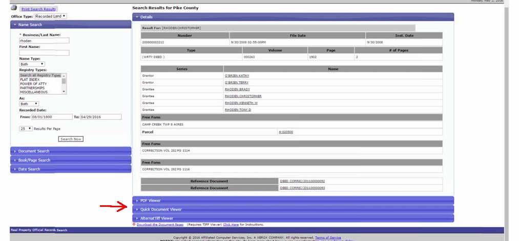 Also, KKearns mentioned that she only saw tax records or something on the site. I can't really remember exactly what you said KKearns, but you responded to me as well. You can see actual deeds, documents, power of attorney... once you do your search, names will pop up on the right side of the screen. Pick the name you want and then it pops up with that persons records. Click on whichever one you want and then a "Details" screen shows up, but what most people don't know is that below the "Details" section there are 3 more lines in blue that say PDF Viewer, Quick Viewer and Tiff viewer. When you click on one of those it pulls up the actual document. I use quick viewer because then it just opens up in the same window. Hope that answers your questions. I put a little pic below with a red arrow to show where you click to see the documents.