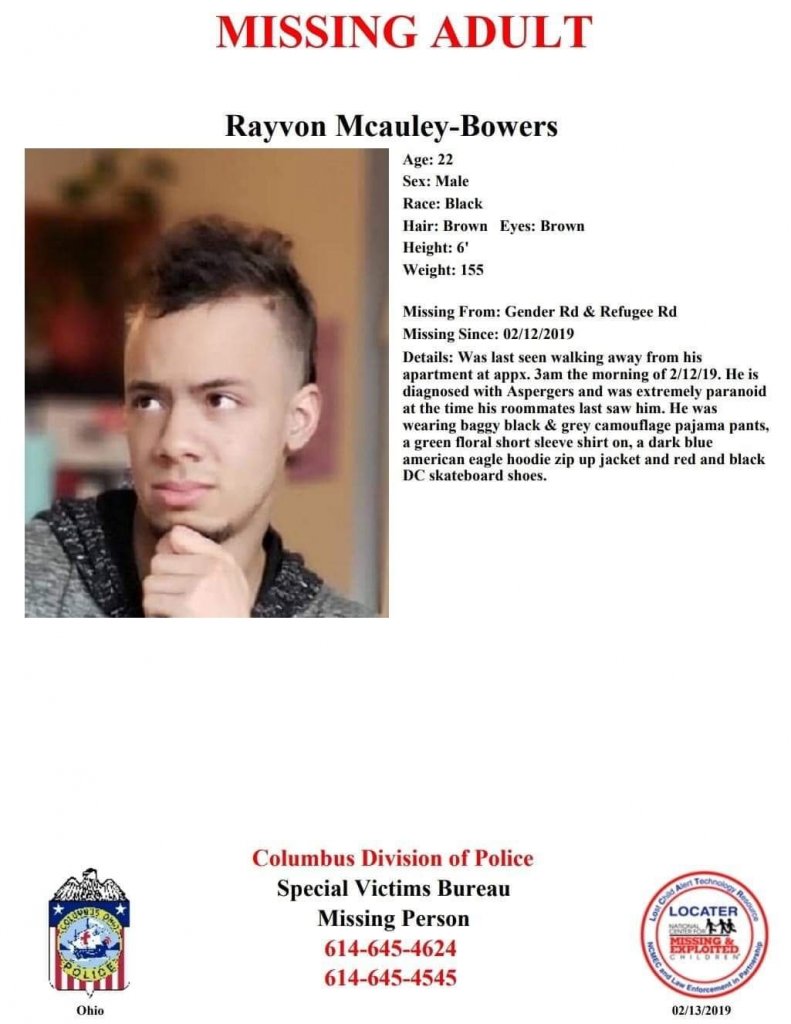 Police said Rayvon Mcauley-Bowers has Asperger's and was last seen walking away from an apartment in the area of Gender Road and Refugee Road around 3 a.m. Tuesday.