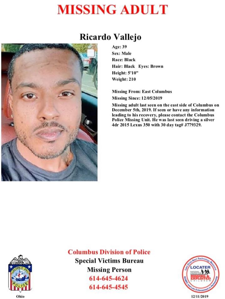 Ricardo Vallejo was last seen on the east side of Columbus on Dec. 5 driving a silver 4-door 2015 Lexus 350 with an unknown 30-day tag number. Vallejo is described as a black male who is 5’10, weighs 210 pounds and has black hair and brown eyes.