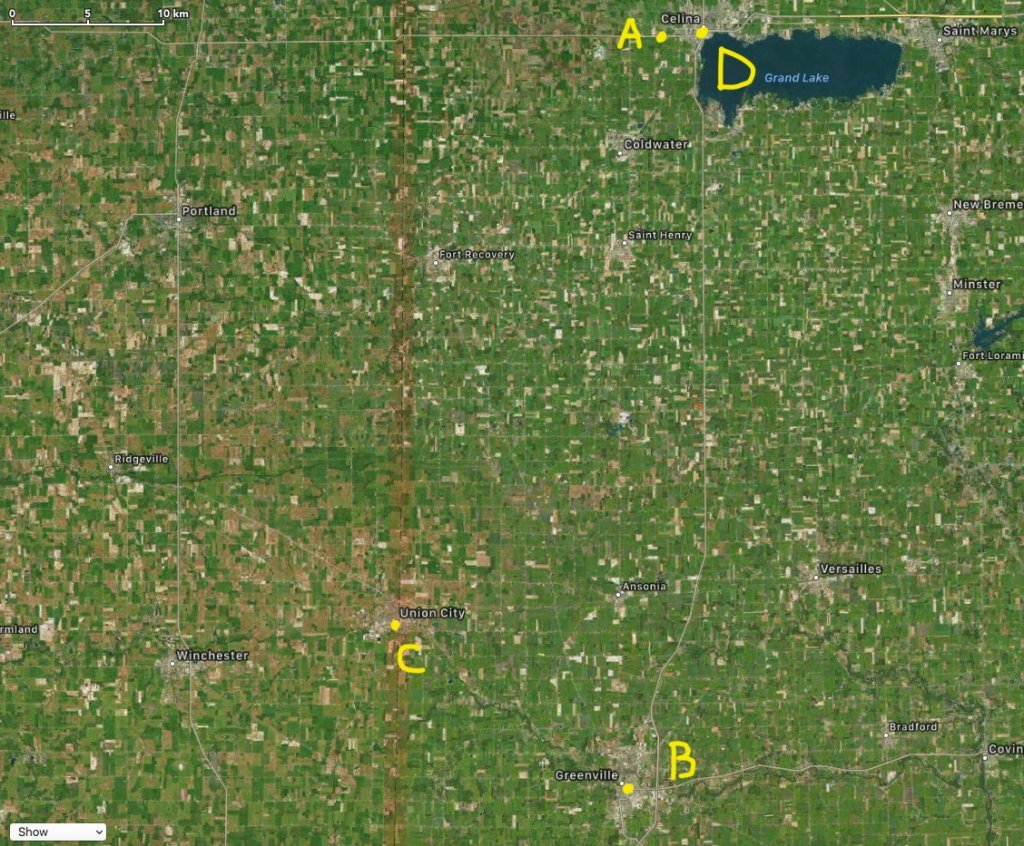 August 4: The investigation thus far has confirmed that Shawna was last seen leaving a location in Union City (C) on Sun Aug 4th at 11:50 AM. She reported to witnesses she was going to an appointment in Celina, Ohio (D) in Mercer County which is approximately 35 miles north and east of Union City.
