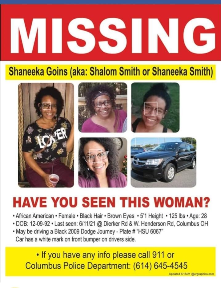 Shaneeka S. Goins, 28, was last seen on June 11 near Dierker Road and Henderson Road in northeast Columbus.