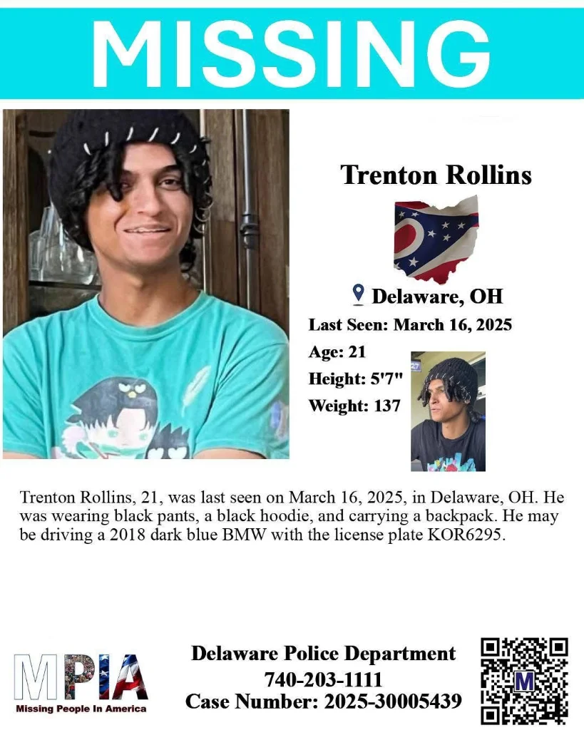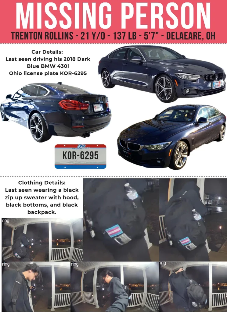 Trenton Reuben Alexander Rollins, 21 years old, has been missing since Monday, March 17, 2025, from Delaware, Ohio—seemingly vanishing along with his car, a 2018 BMW 430i (Ohio plate: KOR-6295).